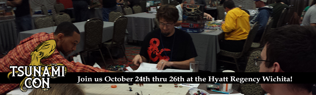 TsunamiCon is Wichita's premiere tabletop gaming convention, presenting a variety of gaming opportunities and related geekery right here in America's heartland. We gather annually in the great city of Wichita for a number of fun and exciting events throughout the weekend, including a variety of tabletop games and RPGs, Featured Events, Demos, Special Guests, Organized Play, Live Entertainment, Panels, Contests and Giveaways, and more...!